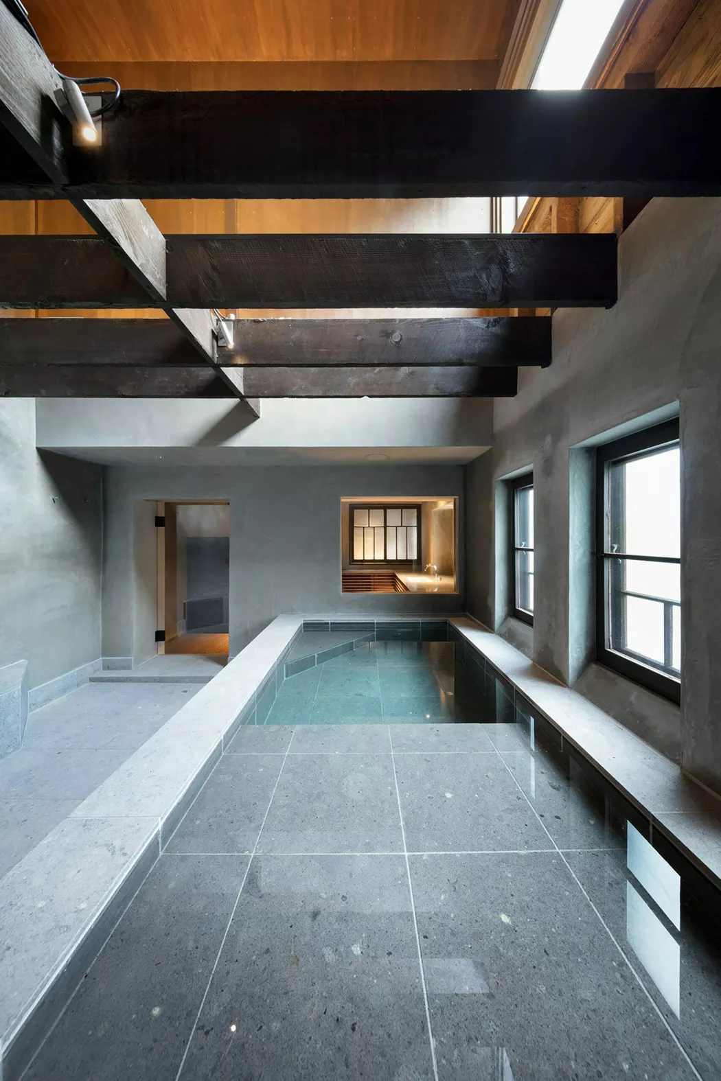 その「葉山加地邸」改修プロジェクトを特に評価いただいた焦点のひとつが、大きな水盤のような浴槽で日本の浴室文化を表現したことです。改築前は使用人の小部屋だったのですが、地下にあったので装飾的な特徴が少なく、文化財のルール上も自由な改修が可能だったので、上階の床を抜き、吹き抜け天井の梁を出して、100年前からの構造を眺めながらの寝湯をつくりだしました。