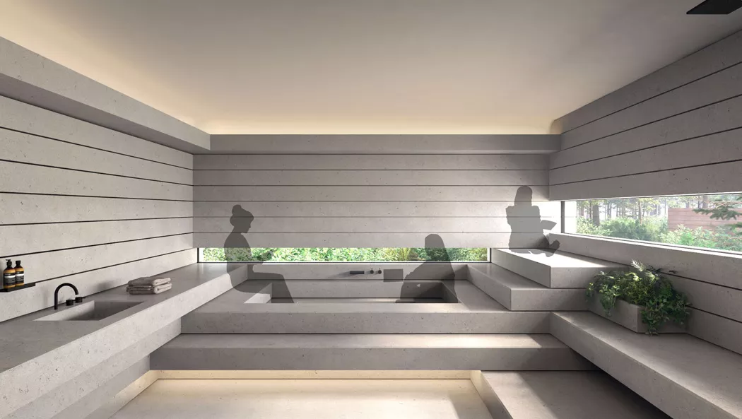 お風呂の向き合い方は人それぞれ。求めていることも様々です。経済的な余裕があれば、レジャーやリゾートでの特別体験を自宅で気軽に楽しみたいと思うのは当然ですし、ひとつの家にお風呂を3つ作ったこともあります。その家の主はアメリカ人アーティストで、彼にとってのお風呂はまさにアイデアの源泉。バスルームの一角でスケッチすることもあるし、自然との一体感を感じられる空間全体がリラクゼーションの場なのです。そこまでラグジュアリーではなくても、家にサウナを設置する人は増えていますし、在宅ワークが当たり前になったことで、仕事とプライベートの境がなくなり、オフィスや住まいそのものの在り方も多様化しています。だからもう、お風呂もバスタブとシャワーという概念に縛られる必要はないのです。