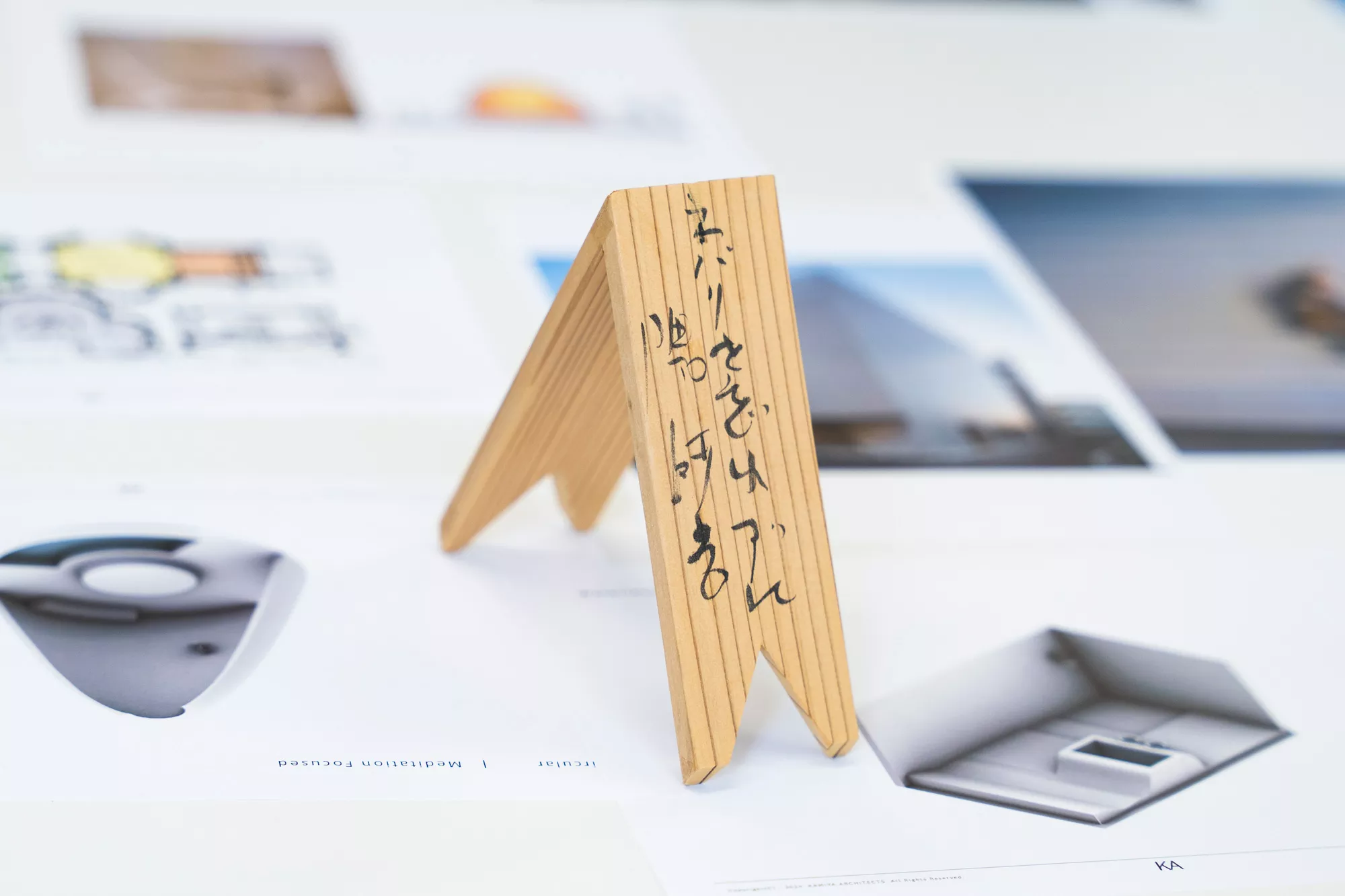 自分の仕事を続ける中で、挑戦をあきらめそうになることがあります。そういう時に、思い浮かぶ言葉があります。隈研吾さんのもとで修業していたときに、TUMIKI というプロダクト開発を担当したのですが、事務所を卒業する際に、隈さんから当時作った小さなつみ木の1ピースをいただいたんです。「粘りを忘れずに。」と手書きで書かれたそのひと欠片は、今も手元にあります。建築は、最後は己との戦いです。負けそうになる度に、この言葉に元気づけられ、最後までデザインのクオリティを追求しようと身を引き締めます。