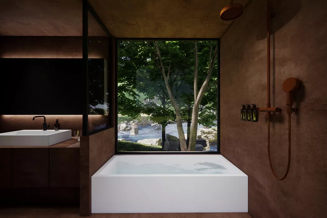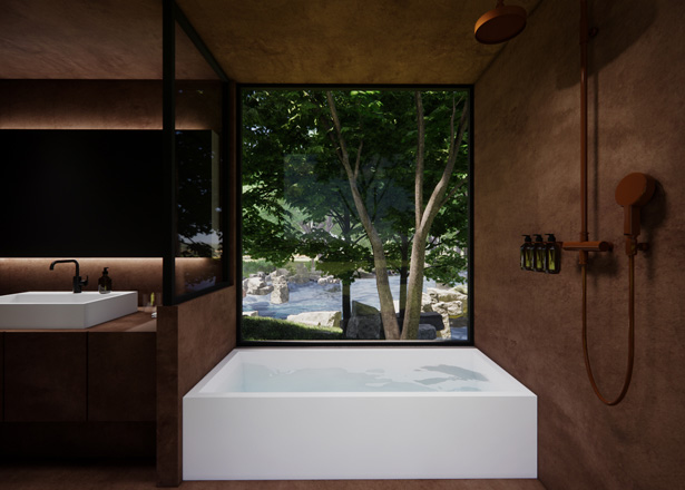 素材で言うと、もし天然素材が使えないとしても、天井、壁、床に至るまでアースカラーを用いてワントーンにまとめるなど、既存の材料であっても塗装の風合いや仕上がりを統制していくことで、上質さは高まります。照明は最低限でいいんです。もし明るさが足りなかったらキャンドルを置いてお風呂に入ってはいかがでしょうか。一日を終えて、心身を整えるために入るケースの多い空間なので少ししっとりさせる。他の部屋と同じように自分に合う照度を作り出す、調光照明的な考え方の方がむしろ適しているんじゃないかと思います。夜になって入るとき、空間が明るすぎるのは時間軸に反しているような気がします。あとは「aq.」はユニットでありながら開口部をかなり自由につくれるというので、やはり窓を大きく開けて外の景色を取り込みたいですね。そうすることで空間が拡張されるような感覚が生じます。視覚的にも気持ちがいいし、換気も良くなる。