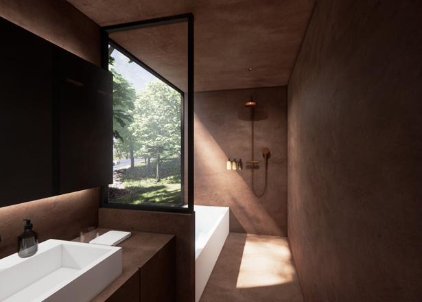 バスルームというのは、カラートーンや照明、アメニティの置き方ひとつでユーザーの感じ方が変わるので、そのあたりは細かく調整する必要があります。一般的にユニットバスというと、どうしてもプラスチックや樹脂でできた、色気のない面構えになってしまうのが残念だと常々思っていますが、ユニットは気密性・断熱性に優れ、水漏れのリスクが低く、何よりコスト的にも安心とメリットが多い。そうした利点を保持しながらデザイン性に優れていれば申し分ないですよね。