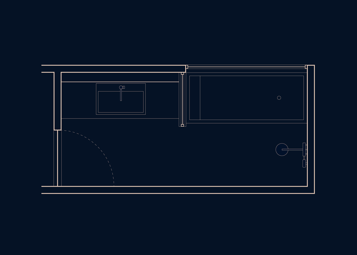 「yado」は規格住宅でありながら、ご希望やバジェットに応じて、幾分のオプションプランのご提供が可能です。「yado」に「aq.」のバスルームを取り入れたとしても矛盾なく噛み合うと思ったので、そのようなケースを想定しデザインしました。比較的コンパクトなスモールラグジュアリーなプランです。